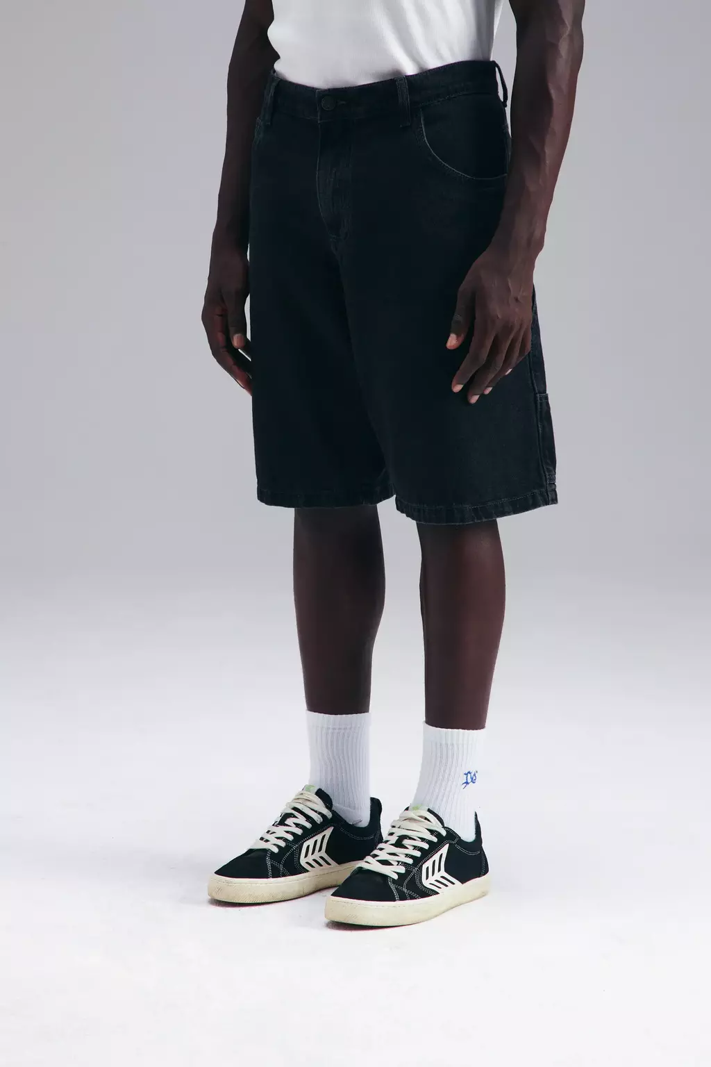 Bermuda jeans 100% algodão confeccionada em denim estonado, garantindo estrutura, resistência e aparência desgastada proposital (washed black) com toque contemporâneo.