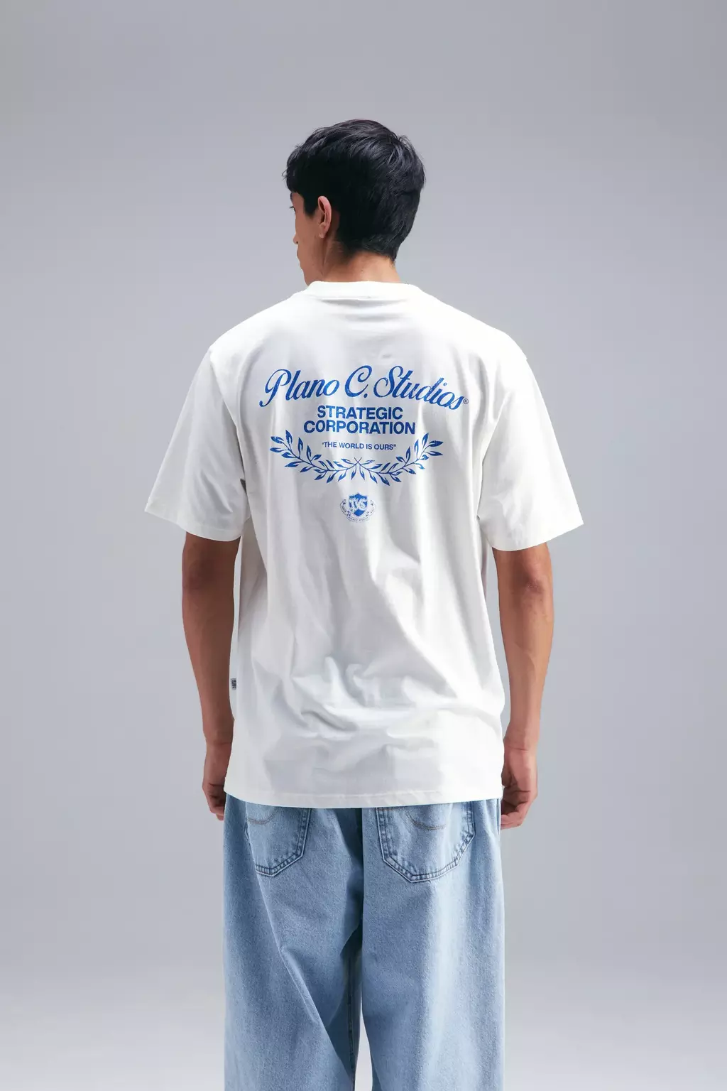 Modelagem com caimento reto, gola careca em ribana 2x1 e reforço interno nos ombros. Estampa aplicada no lado esquerdo do peito e nas costas.